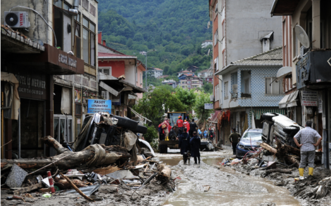 12일(현지시간) 터키 카스타모누주 보즈쿠르트 지역의 홍수 피해 현장에서 구조대가 구조활동을 하고 있다. 터키 북부 바르틴·카스타모누·시노프·삼순 등 흑해 연안 지역에 내린 폭우로 홍수와 산사태가 발생해 지금까지 최소 17명이 숨졌다. [신화 뉴시스]