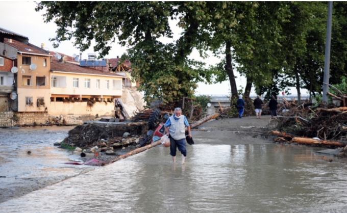 12일(현지시간) 터키 카스타모누주 보즈쿠르트 주택가에서 한 주민이 홍수로 침수된 도로를 건너가고 있다. [신화 뉴시스]