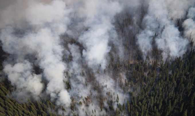 12일(현지시간) 캐나다 브리티시컬럼비아주 버논 서쪽 인근에서 '화이트록 레이스 산불'이 발생해 연기가 피어오르고 있다. [AP 뉴시스]