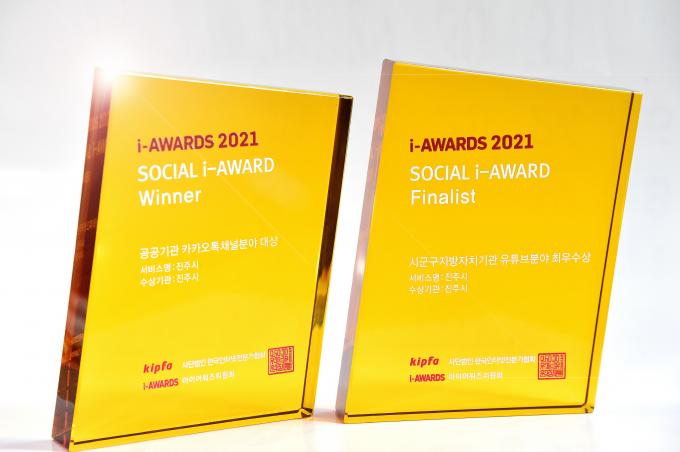 경남 진주시는 한국인터넷전문화협회가 주최하고 한국인터넷진흥원 등이 후원하는 '소셜아이어워드 2021'에서 공공기관 카카오톡 채널 부문 대상, 시·군·구 지방자치 기관 유튜브 부문 최우수상을 각각 수상했다고 18일 밝혔다.
