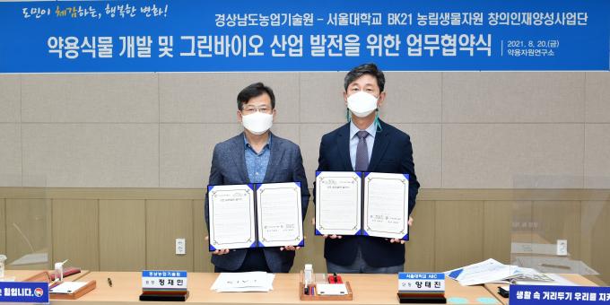 경남도농업기술원은 20일 함양군 안의면에 있는 약용자원연구소에서 서울대학교 BK21 농림생물자원 창의인재양성사업단과 약용식물 개발 및 그린바이오산업 과학기술 발전을 위한 업무협약을 체결했다.
