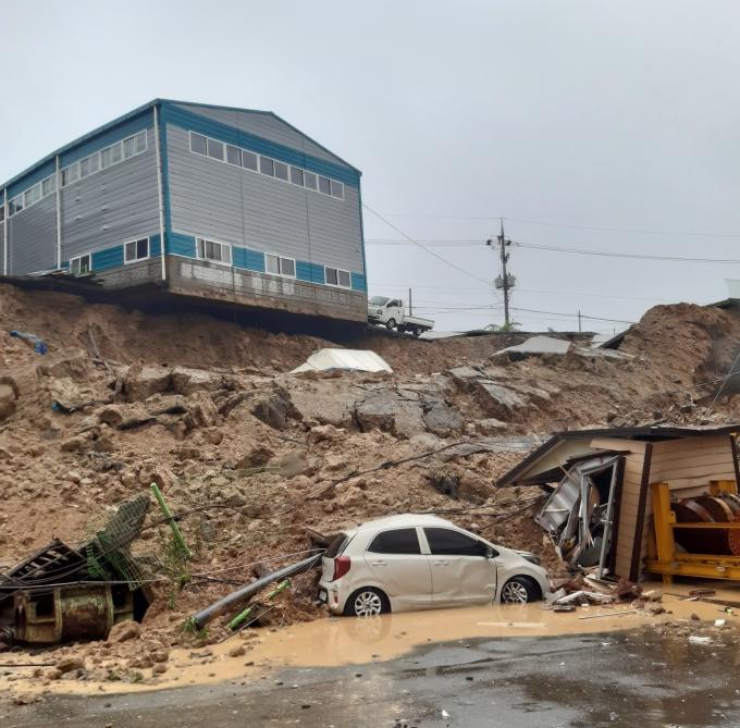 이 사고로 토사가 흘러내리면서 옹벽 아래 주차된 모닝 차량과 인근의 전주 등이 파손됐다. 다행히 인명피해는 없었다.