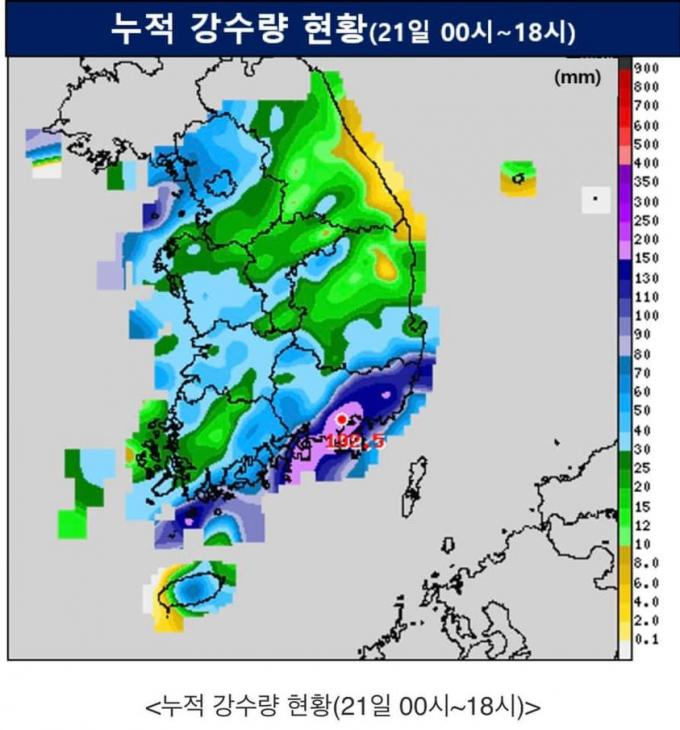 이날 0시부터 저녁 6시 현재까지 내린 강수량은 창원(진북) 192.5㎜, 남해(상주면) 187.5㎜, 통영 182㎜, 삼천포 175.5㎜, 김해 124㎜, 밀양 120㎜ 등 해안 지역을 중심으로 200㎜ 가까운 비가 내렸다.