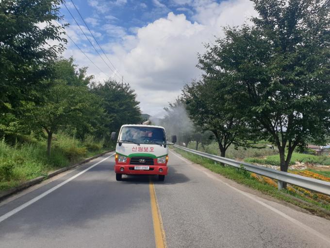 거창군은 직영방제단을 통해 친환경 약제를 이용하여 피해가 심한 황강천변 일대 가로수와 공원에 집중방제를 실시하고 있다.