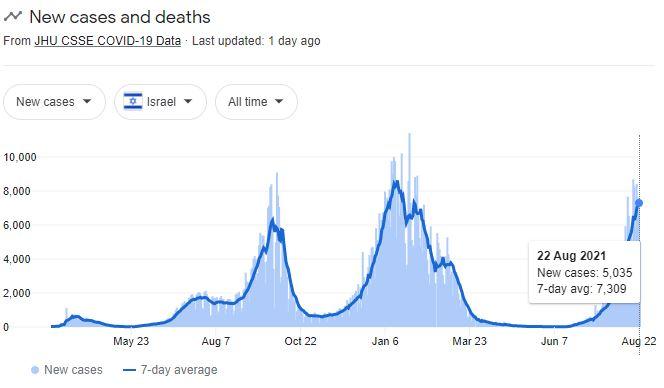 최근 이스라엘의 일일 평균 확진자는 7300여 명에 달하고 있으며 지난 5~7월 한 자릿수였던 일일 사망자도 20명 이상으로 늘었다.