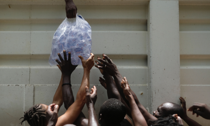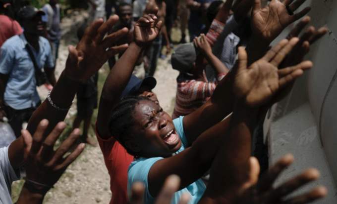 아이티 지진 발생 9일째인 22일(현지시간) 레카이 지역 피해 시민들이 식량 배급트럭에서 나눠주는 물을 받으려 필사적으로 손을 뻗고 있다. 사상자는 이날 현재 사망 2207명, 부상 1만2268명이다. [AP 뉴시스]