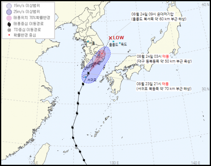 태풍 오마이스는 자정 무렵 경남 사천에 가장 근접할 것으로 보고 있다. 중심기압 998hPa, 최대풍속 시속 65㎞ 규모다.