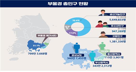2020년 기준 부·울·경의 총인구(외국인 포함)는 799만3668만 명이다. 이는 전국 인구 5297만4563명의 15.1%에 해당한다.
