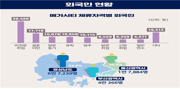 도시 특성에 따라 외국인 거주 목적이 차이를 보이는데, 대학이 많은 부산은 '유학'을 위해 거주하는 외국인이 가장 많았고, 제조업체가 많은 울산·경남은 '비전문 취업'을 목적으로 한 경우가 가장 많았다.