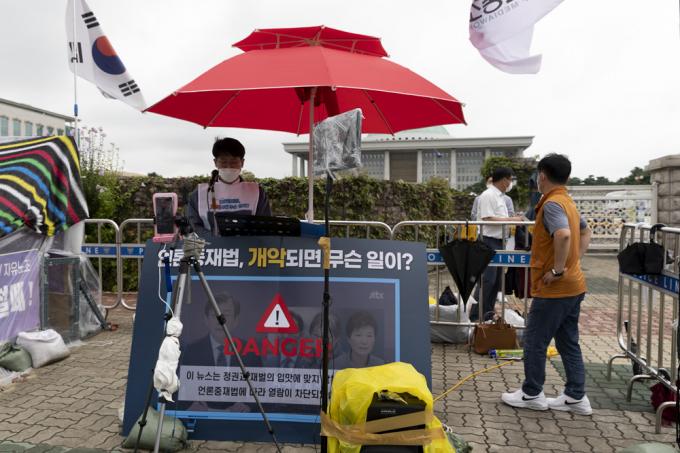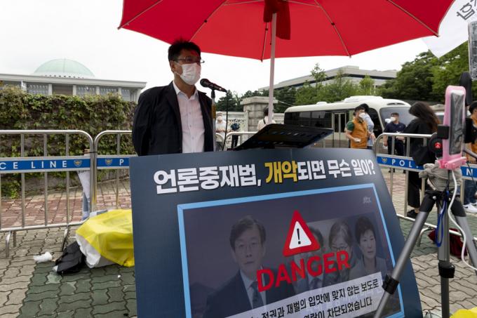 25일 국회 앞에서 '언론중재법 강행 처리 중단 촉구' 필리버스터(무제한 토론)중인 방송기자연합회 성재호 회장