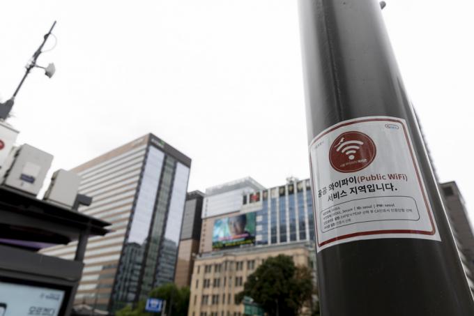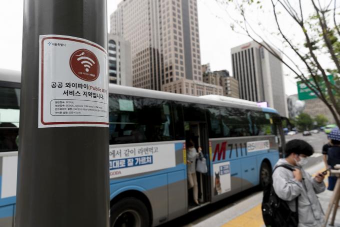 25일 서울 중구의 한 버스 정류소에 '공공 와이파이 안내문'이 붙어 있다. 서울시는 2340개 버스 정류소에 공공 와이파이 구축을 완료했다고 24일 발표했다. 첫 이용시 'SEOUL_Secure'로 설정하면 해당 와이파이가 설치된 모든 정류소에서 자동으로 연결된다. ID와 비밀번호는 모두 'seoul'이다.