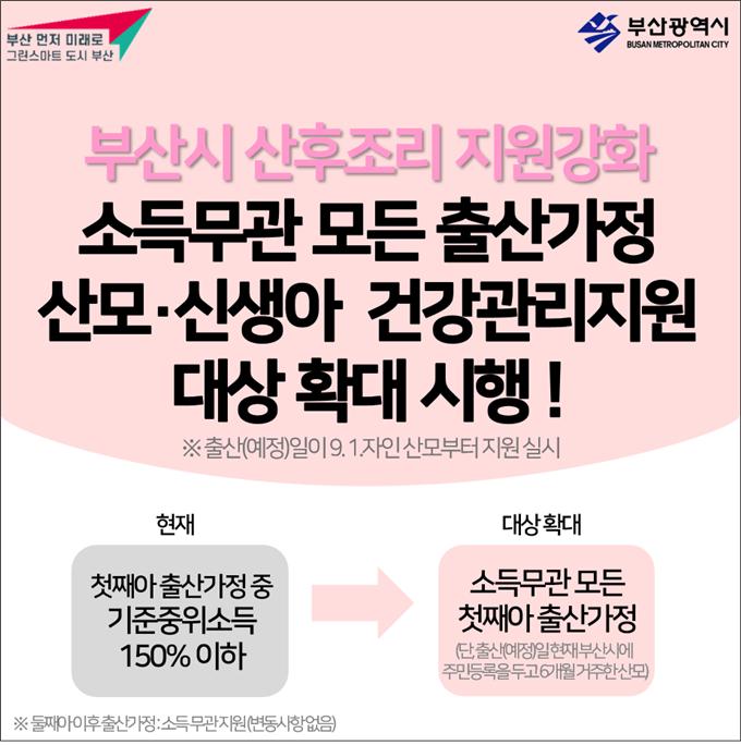 이렇게 되면 부산시의 모든 출산가정에는 소득 기준과 관계없이 산모·신생아 건강관리사업이 지원된다. 이번 사업 대상자 확대로 부산지역 서비스 대상자는 한 해 8000여 명에서 1만600여 명으로 늘어날 것으로 예상된다.