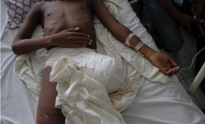 25일(현지시간) 아이티 레카예의 한 종합병원에서 이번 지진으로 중상을 입은 한 소년이 다리 절단 수술을 마치고 침대에 누워 있다. [AP 뉴시스]