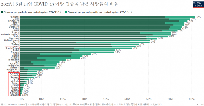 아워월드인데이터의 백신 접종비율 도표(그림)를 보면 백신 불평등이 선명하게 드러난다. 유럽과 북남미, 중동의 고소득 국가는 백신 접종율이 70% 이상인 반면에 저소득 국가가 많은 아프리카는 100명 당 접종 횟수가 6.4회분으로, 세계인구 100명 당 접종 횟수의 10분의 1 수준이다.