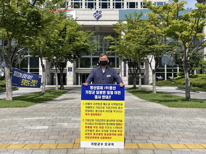 이와 관련, 오규석 군수는 지난 18일부터 매일마다 시청 앞에서 1인 시위를 이어오고 있다. 30일에도 오전 이전 계획 철회를 요구하며 팻말을 들고 1인 시위를 벌였다.