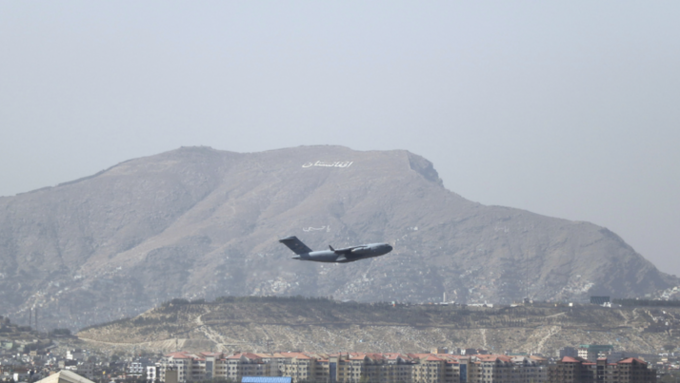 31일 미군 철수 시한을 앞두고 28일(현지시간) 카불 하미드 카르자이 국제공항에서 미군 수송기가 이륙하고 있다. 미 국방부는 대피 작전을 지원하는 미군이 카불 공항에서 철수를 시작했다고 밝혔다.