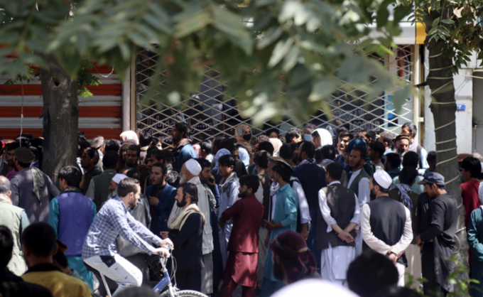 28일(현지시간) 수도 카불의 카불은행 ATM기기 앞에 현금을 인출하려는 아프가니스탄인들이 몰려 있다. [AP 뉴시스]