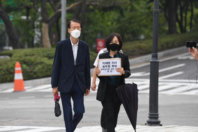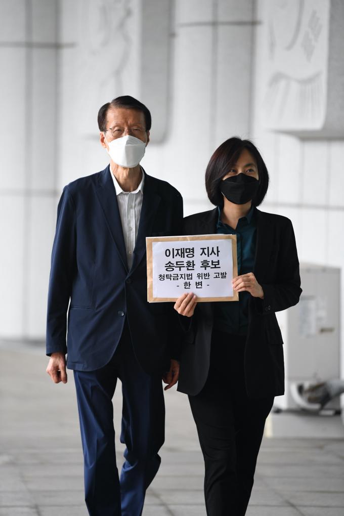 '한반도 인권과 통일을 위한 변호사모임' 관계자들이 31일 '무료 변론' 논란이 불거진 이재명 경기지사와 송두환 국가인권위원장 후보자 고발장을 제출하러 서울 서초구 대검찰청에 들어서고 있다.