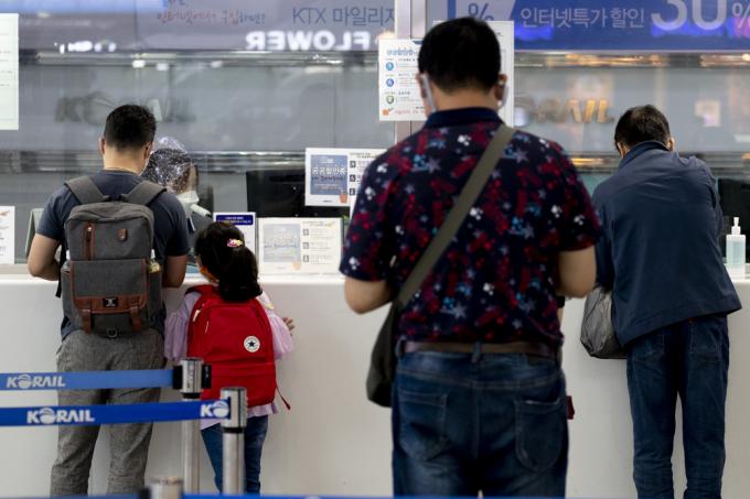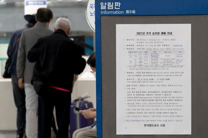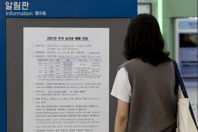 2021년 추석 승차권 예매가 시작된 31일 서울역에서 한 시민이 예매 안내문을 보고 있다. 코레일은 추석 승차권을 다음달 2일까지 사흘간 온라인과 전화 등 100% 비대면 방식으로 사전 판매한다. 대상 열차는 9월 17일부터 22일까지 6일 동안 운행하는 KTX·ITX-새마을·무궁화호 열차 등이다. 승객 간 거리두기를 위해 창 쪽 좌석을 우선 판매한다. 예매에 포함되지 않은 내측 좌석은 9월 중 정부의 코로나19 방역 대책에 따라 판매 여부가 결정된다.