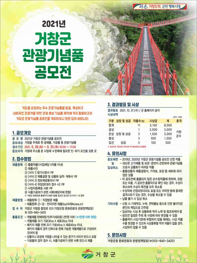 경남 거창군은 오는 28일부터 30일까지 '2021년 관광기념품 공모전'을 마련한다고 1일 밝혔다.