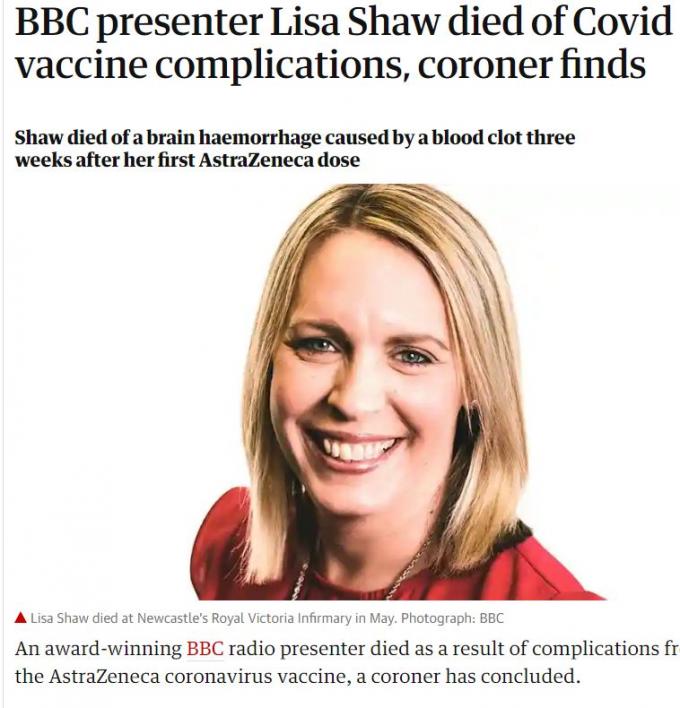 영국 가디언지의 보도에 따르면 영국 뉴캐슬 검시소는 그동안 리자 쇼의 사망원인을 조사한 결과 코로나 백신 접종에 따른 혈전과 뇌출혈이 직접적인 원인이라고 밝혔다.