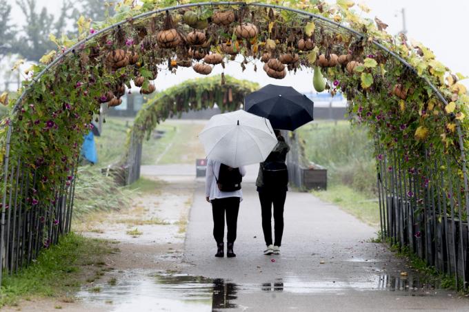 이슬이 맺히고 가을이 시작된다는 절기상 백로(白露)인 7일 서울 마포구 하늘공원. 시민들이 호박이 주렁주렁 달린 길을 걷고 있다.