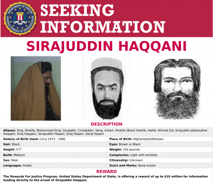 FBI의 테러리스트 지명수배자 명단에는 현재 45명이 올라 있는데, 하카니의 경우 '하카니 네트워크'의 고위 지도자로 탈레반과 알카에다와 긴밀한 관계를 유지하고 있는 세계적인 테러리스트로 정보 제공자에 대한 현상금 1000만 달러에 지명 수배돼 있다.