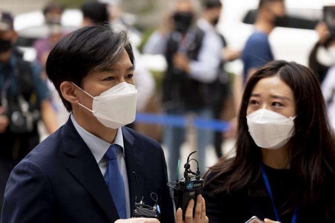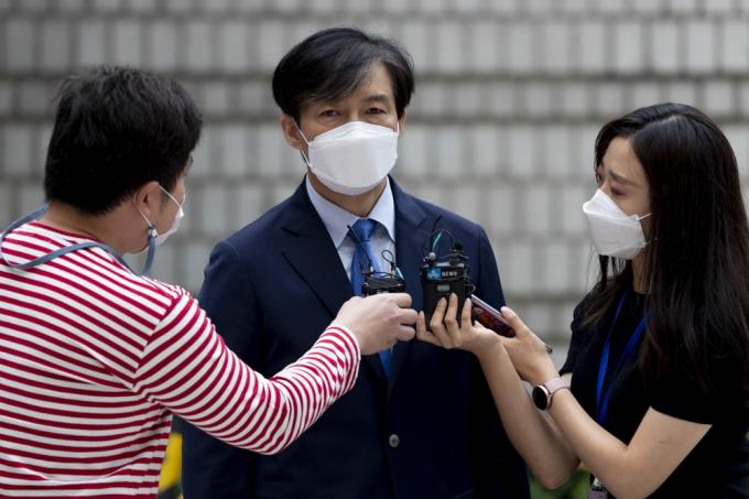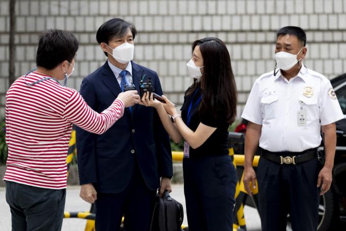 조국 전 법무부 장관이 10일 서울중앙지법에서 열리는 자녀 입시비리 등 재판에 출석하며 취재진 질의에 답하고 있다.