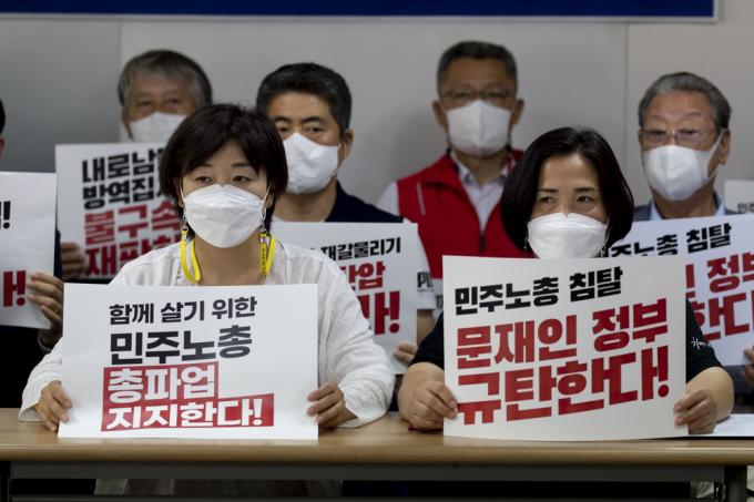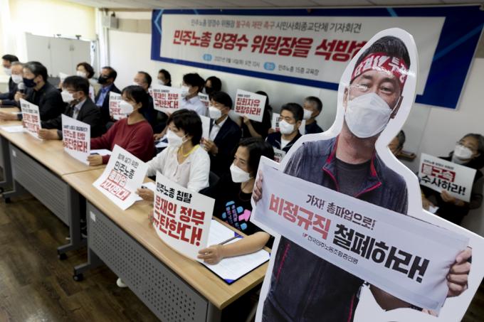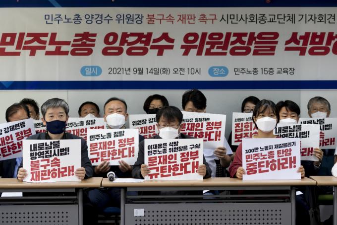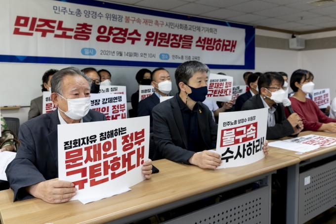2040개 시민사회종교단체 대표자들이 14일 서울 중구 민주노총에서 '양경수 위원장 불구속 재판 촉구, 문재인 정부 규탄' 기자회견을 하고 있다.
