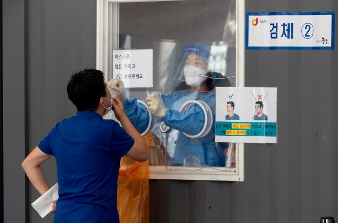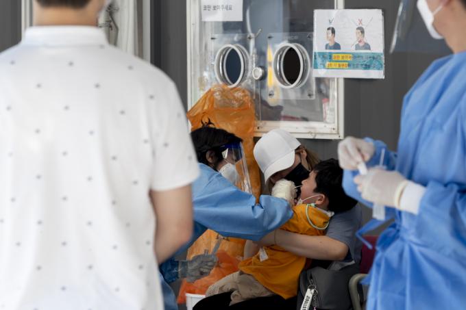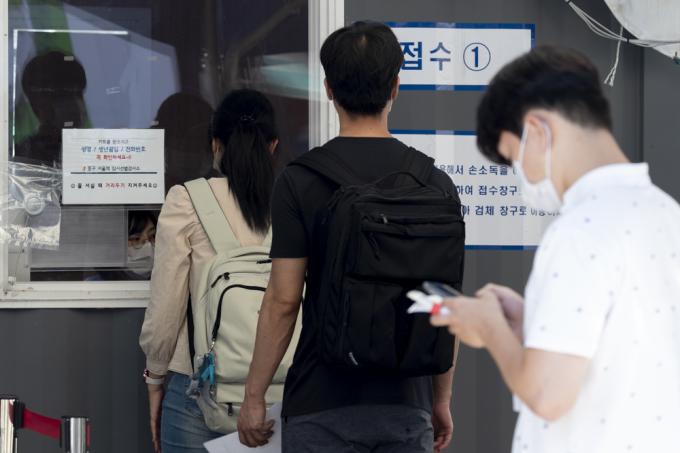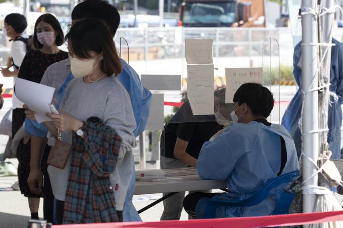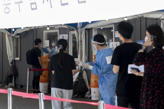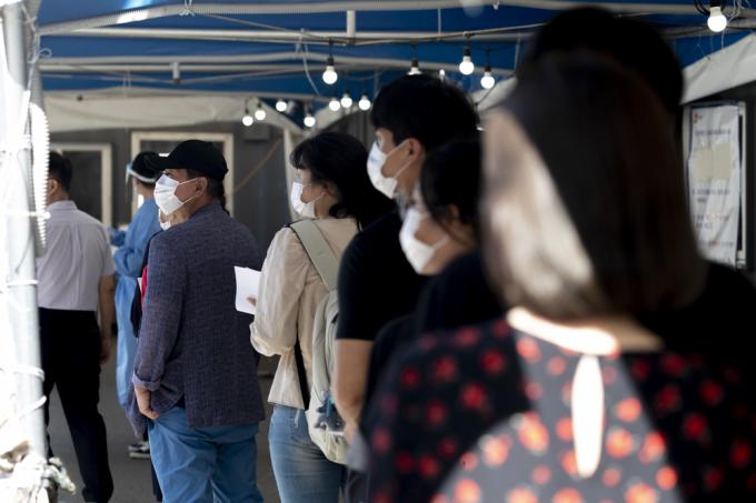 추석 연휴를 앞둔 15일 서울역 임시선별진료소에서 시민들이 검사를 받기 위해 줄지어 서 있다. 이날 0시 기준 코로나19 신규 확진자는 2080명으로 확인됐다. 서울 등 수도권은 코로나19 사태 이후 최다를 기록했다.