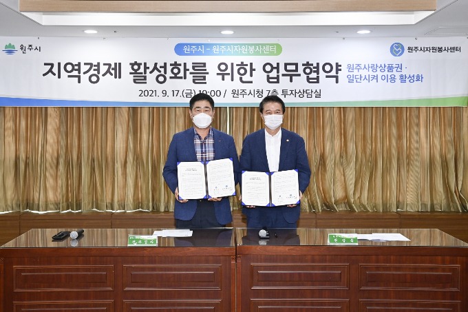 원주시와 원주시자원봉사센터는 17일 오전 10시 원주시청에서 지역경제 활성화를 위한 업무협약을 체결했다.