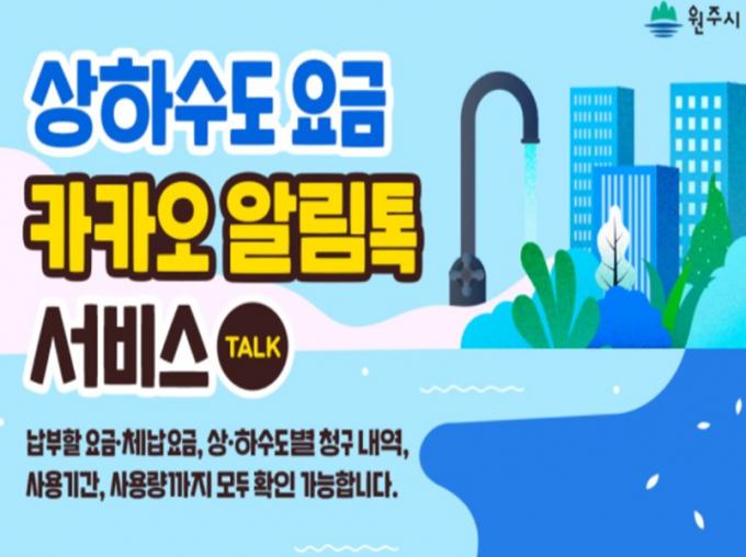 원주시는 최근 환경부에서 수도요금 부과를 전자고지 방식으로 변경해 탄소중립을 실천하고 있는 우수 지자체 사례 중 하나로 원주시 상하수도요금 카카오 알림톡 서비스를 선정했다고 밝혔다.