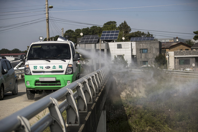 또 광역방제기, 방역 차량, 축협 공동방제단, 군 제독 차량을 동원해 야생멧돼지 ASF 발생지와 유휴지 및 양돈농가 입구 및 주변 도로를 소독하고 있다.