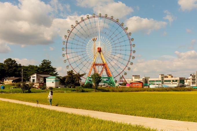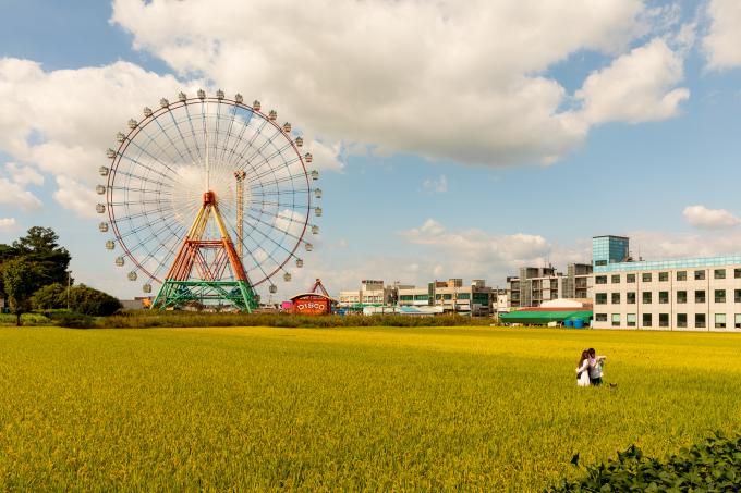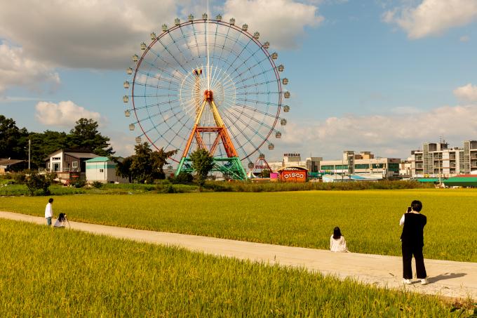 절기상 낮과 밤의 길이가 같아지고 논밭의 곡식을 거두어들인다는 추분(秋分)인 23일 충남 당진 삽교호 주변 풍경. 황금빛으로 물든 논 너머 우뚝 솟은 놀이동산 대관람차가 이채롭다.