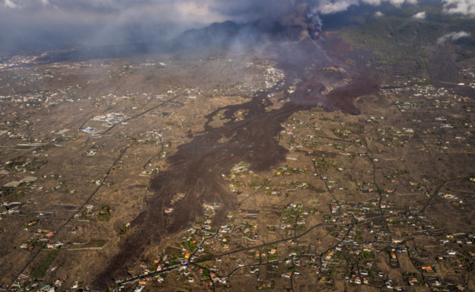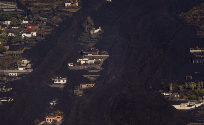 23일(현지시간) 스페인 카나리아제도 라 팔마 섬 주택들이 용암으로 덮이고 있다. 지난 19일 발생한 쿰브레 비에호 화산 폭발로 주민 수천 명이 대피했으며 전문가들은 여파가 80일 이상 지속할 것이라고 내다봤다. [AP 뉴시스]