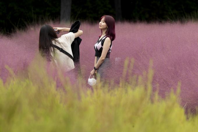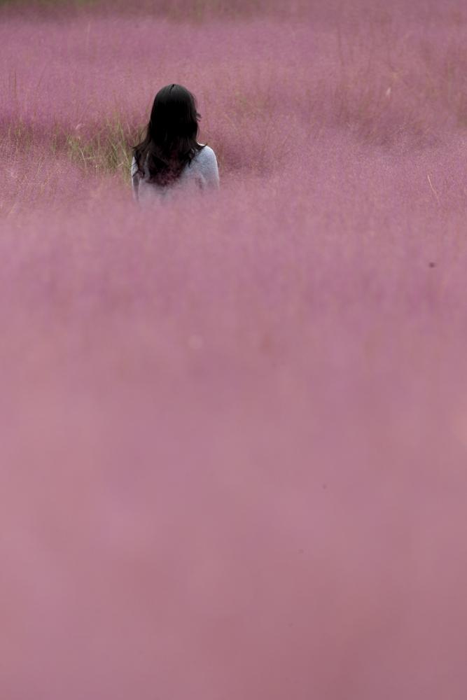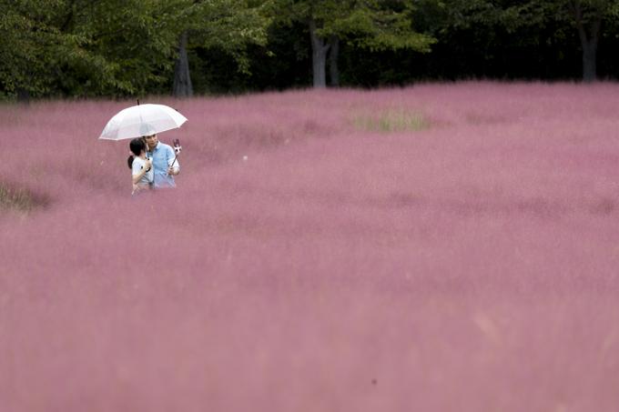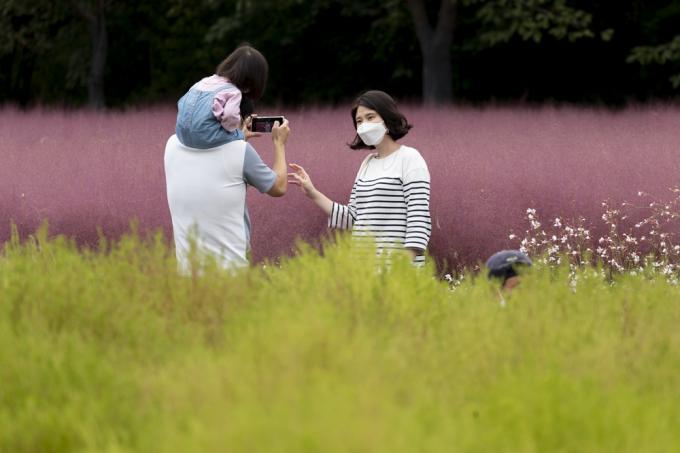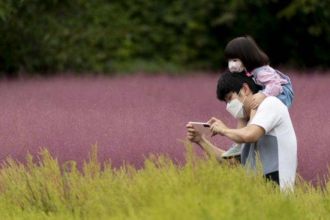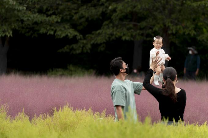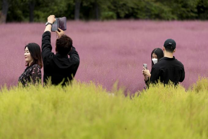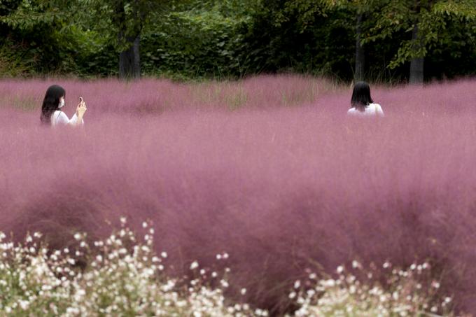 27일 서울 송파구 올림픽공원 핑크뮬리밭을 찾은 시민들이 가을 정취를 만끽하고 있다.
