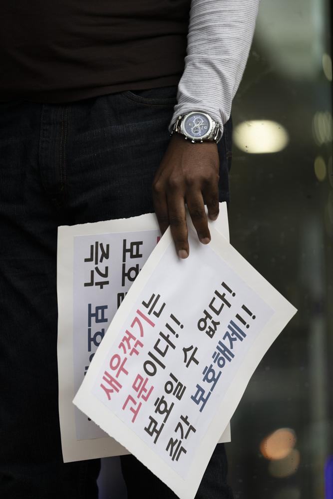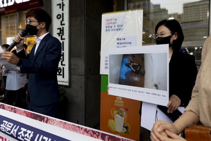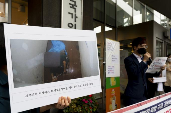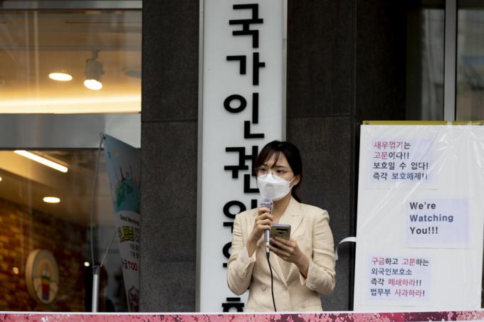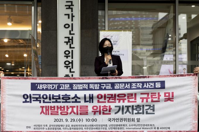 사단법인 두루 이한재 변호사가 29일 서울 중구 국가인권위원회 앞에서 화성 외국인보호소 '새우꺾기'고문, 징벌적 독방 구금, 공문서 조작 사건과 관련해 '인권유린 규탄 및 재발 방지 촉구' 기자회견을 하고 있다.