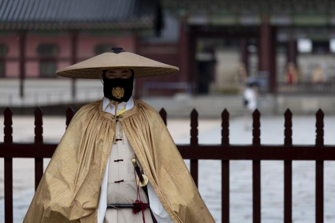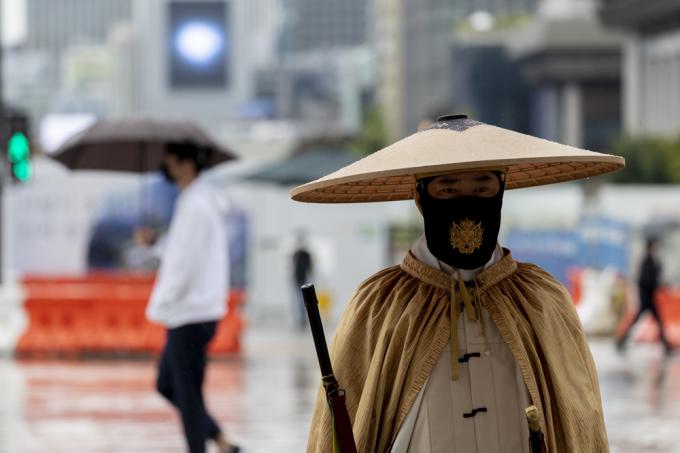 가을비 내리는 29일 서울 경복궁 광화문 수문장의 옷차림이 이색적이다. 고증을 통해 재현한 조선시대 군사 우비용 의상인 유삼(油衫)과 쓰개(지삿갓, 갈모)를 걸쳤다.