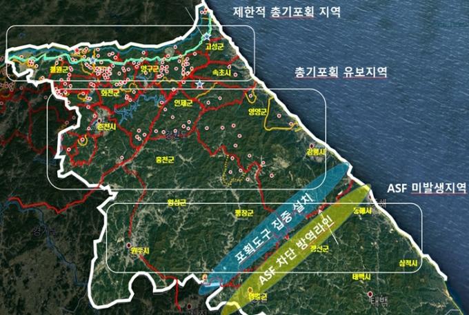 강원도는 ASF의 전국적 확산을 막기 위해 오늘부터 내년 3월 말까지 강원 남부권을 중심으로 ASF 차단라인을 구축하고 야생멧돼지 개체수의 감축을 위해 '동절기 야생멧돼지 집중포획 대책'을 추진한다고 밝혔다.