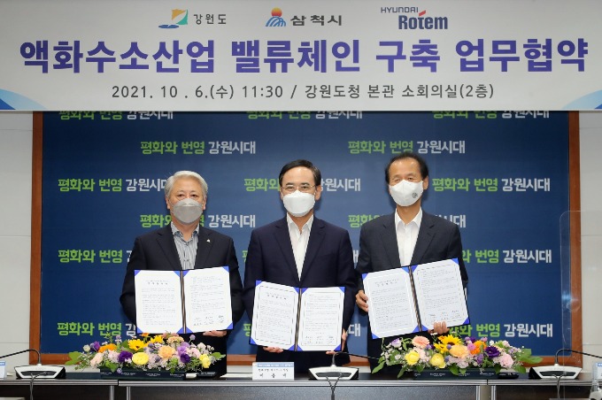 강원도, 삼척시, 현대로템은 6일 오전 '강원도 액화수소산업 밸류 체인 구축을 위한 상호협력에 관한 업무협약'을 체결했다.