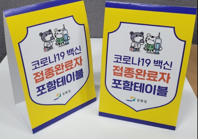 강원도는 오는 13일부터 도내 음식점, 카페 등 필요한 사업장에 '백신접종 완료자' 포함 테이블 안내판 10만 장을 도내 18개 시군 위생부서를 통해 사업장으로 일괄 배부한다.