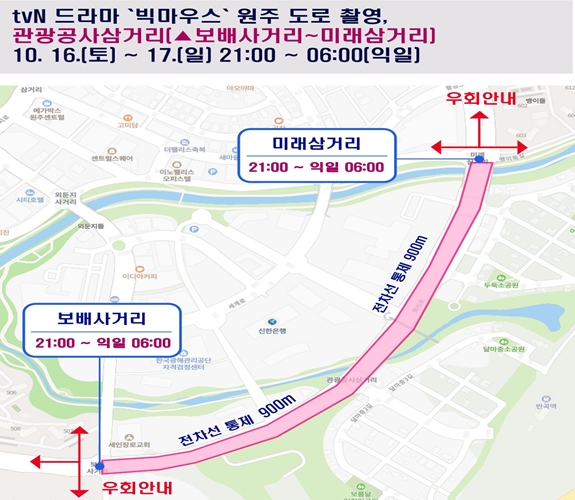 tvN 드라마 '빅마우스'의 촬영으로 16일과 17일 각각 오후 9시부터 다음날 새벽 6시까지 원주 관광공사삼거리(보배사거리~미래삼거리) 1㎞ 구간이 전면 통제된다.
