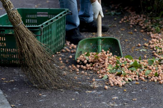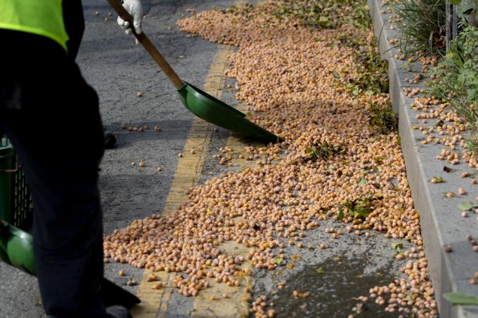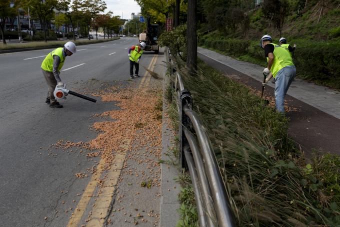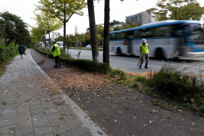 요리조리 피해 걷는다지만 '완전방어'는 쉽지 않다. 흩뿌려진 은행은 지뢰처럼 발밑에서 폭발한다. 환경미화원의 부지런한 손길이 닿기엔 지뢰밭이 너무 넓다.