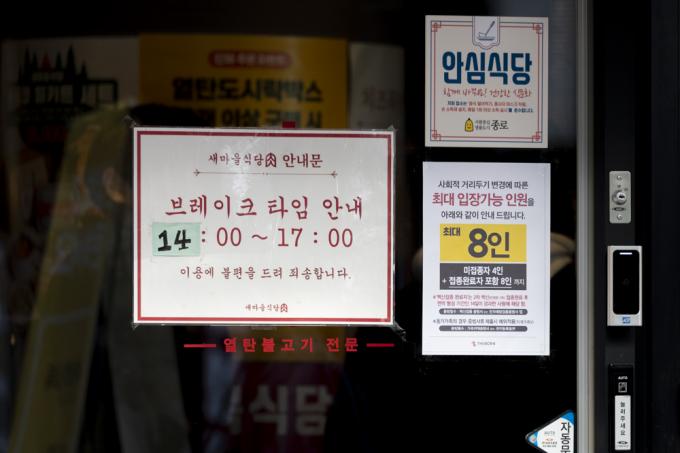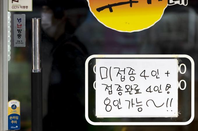 새로운 사회적 거리두기 시행 첫날인 18일 서울 종로 한 식당에 인원제한 안내문이 걸려 있다. 2주간 시행되는 이번 조정안은 수도권 내 식당 및 카페는 밤 10시까지 접종 완료자(4~8명)를 포함해 최대 8명, 비수도권은 자정까지 최대 10명이 모일 수 있다.