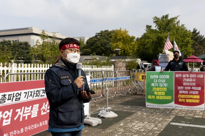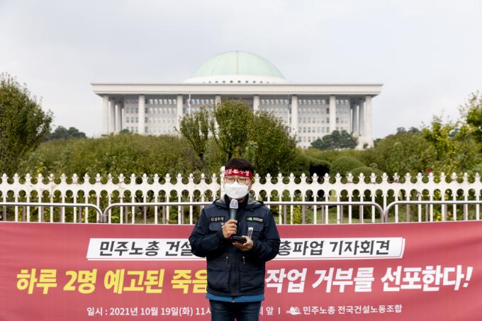 민주노총 건설노조가 19일 서울 여의도 국회 앞에서 '하루 2명 예고된 죽음, 위험작업 거부 선포' 10·20 총파업 기자회견을 하고 있다.
