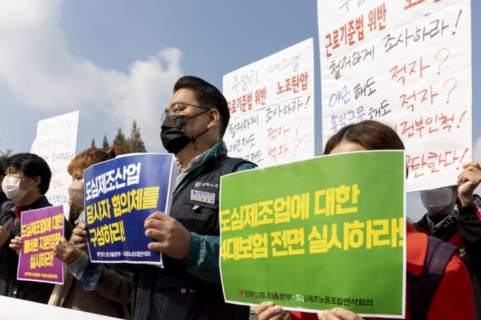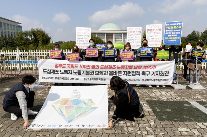 도심제조업 노동자들이 19일 국회 앞에서 '도심제조 노동자 노동기본권 보장과 올바른 지원 정책 마련'을 촉구하는 피켓시위를 벌이고 있다. 도심제조업이란 제화·봉제·주얼리·인쇄업종을 말한다. 이들은 4대보험 적용을 비롯한 노동기본권 보장과 도심제조업 정부 지원을 촉구했다.