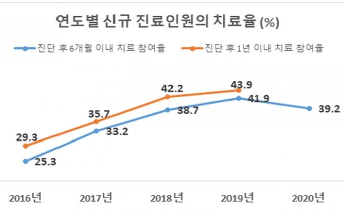 진단 후 6개월 이내에 치료받은 비율은 2016년 25.3%에서 2020년 39.2%로 증가했다. 또한 1년 이내에 치료받은 비율은 2016년 29.3%에서 2019년 43.9%로 증가했다.