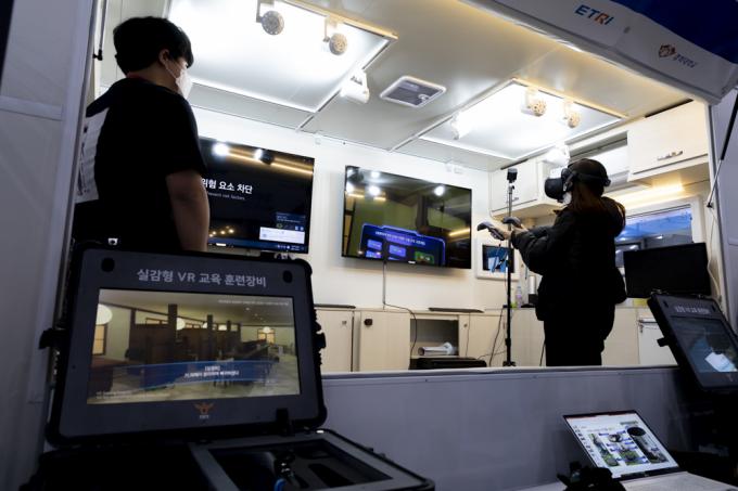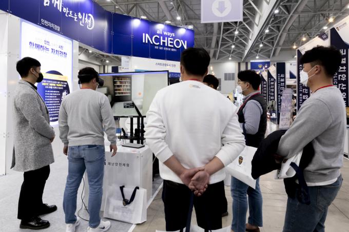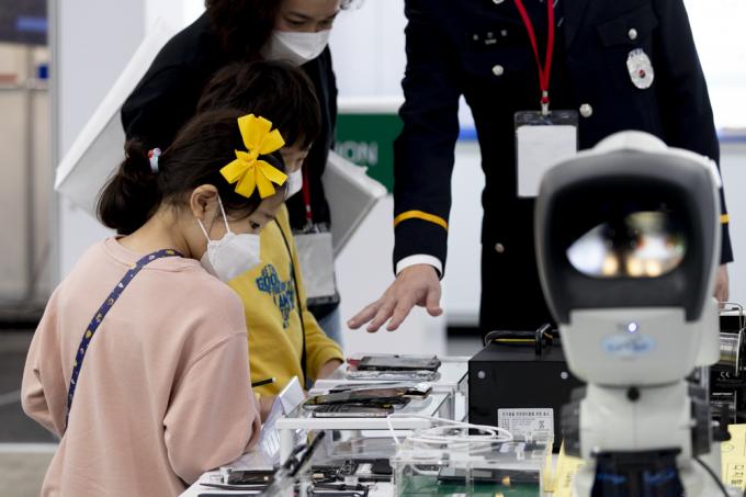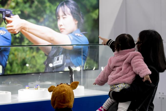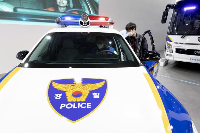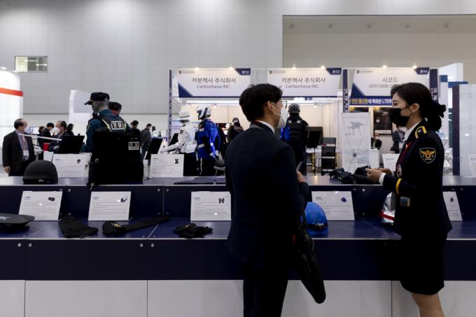 제76주년 경찰의 날인 21일 인천 송도컨벤시아에서 진행되고 있는 '국제치안산업박람회'. 엄마 품에 안긴 아기의 모습이 앙증맞다.