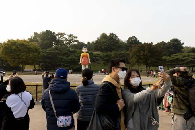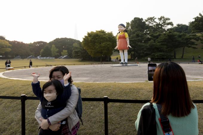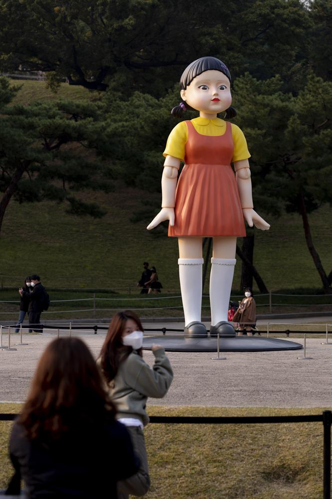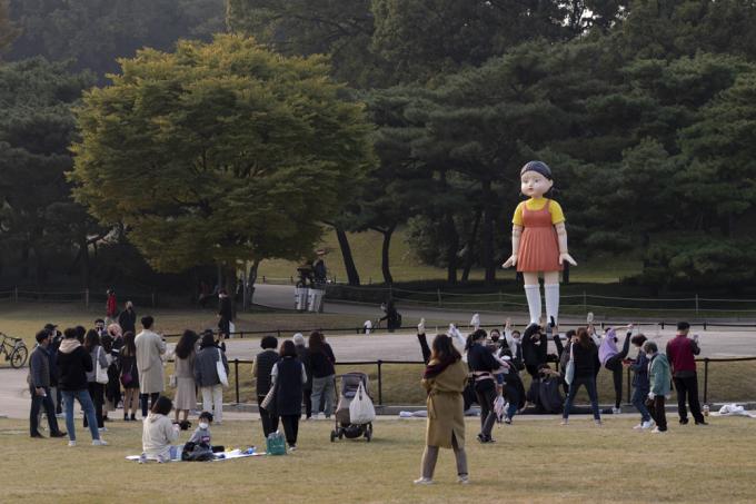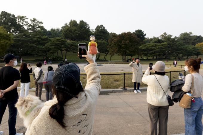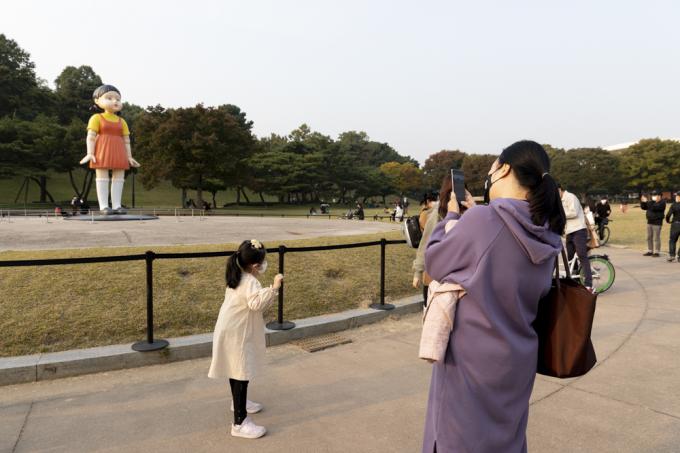 넷플릭스 드라마 '오징어게임'이 지구촌을 휩쓸고 있는 가운데 서울 송파구 올림픽공원 88잔디마당에 '오징어게임' 속 로봇 영희가 등장, 시민들의 눈길을 끌고 있다.