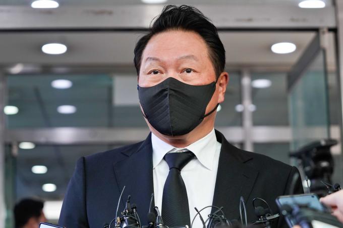 SK그룹 최태원 회장이 27일 서울 종로구 서울대병원 장례식장에 마련된 고 노태우 전 대통령 빈소 조문을 마친 뒤 취재진의 질문에 답하고 있다. 노 전 대통령은 지난 26일 향년 89세를 일기로 별세했다. [사진공동취재단]